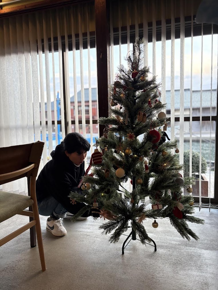 一棟貸しの空間にツリーが運ばれてくるだけで、空気が一変します。空間にふさわしい木の枝で雪の結晶を模ったものや、手編み風のセーターや靴下のアイテム。ひとつひとつ丁寧にオーナメントを枝にかけていく時間は、私たちにとってもささやかながらも幸福な冬の儀式なのです。